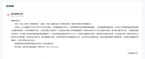 榆中县委办公室对此高度重视,经核实回复称,X320道路已于2025年9月30日正式通车,为保障道路通行安全,目前已完成75米减速带铺设和重点路口减速标线施划,引导车辆降低车速;完成各路口硬化与沥青路面铺筑,新增8处黄闪灯与12处交通标识标牌,提升路口通行安全性;在马莲山大桥等关键位置新增防撞桶90个,并在特定路段新增波形护栏1871米,筑牢道路安全防线;将连麻公路十字路口信号灯迁移至安全合规位置,有效优化交通引导,规范道路通行秩序。