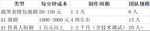 AI短剧的核心优势在于“降本增效”,但不同类型的成本与周期差异显著: