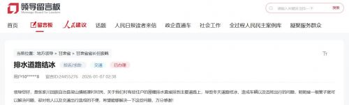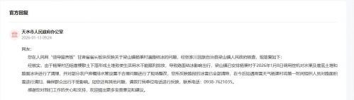 天水市人民政府办公室在回复中表示,经张家川回族自治县梁山镇人民政府核实,由于杨渠村四组崖梗散土下落形成土堆致使生活用水不能顺利排放,导致路面结冰影响出行,梁山镇已安排杨渠村于2026年1月8日调用挖机对水渠及崖底土堆和路面冰块进行了清理,并对部分农户房檐排水管设置不合理问题进行现场整改。并表示今后如遇雨雪天气杨渠村将第一时间组织人员对路面积雪进行清扫,确保群众出行不受影响。