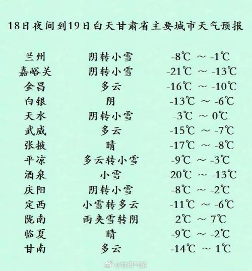 今天夜间到明天白天(1月18日20时-1月19日20时),定西、陇南、天水、平凉、庆阳等市阴有小雪或雨夹雪,其中平凉、庆阳两市局部地方有中雪,陇南市东南部有冻雨;兰州、白银、临夏三市州阴间多云,部分地方有小雪或阵雪;省内其余地方多云间阴,局部地方有阵雪或小雪。